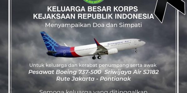 Keluarga Besar Korps Kejaksaan Republik Indonesia menyampaikan doa dan simpati untuk keluarga dan kerabat penumpang serta awak Pesawat Boeing 737-500 Sriwijaya Air SJ182 Rute Jakarta – Pontianak. Semoga keluarga yang ditinggalkan diberikan kekuatan dan kesabaran.